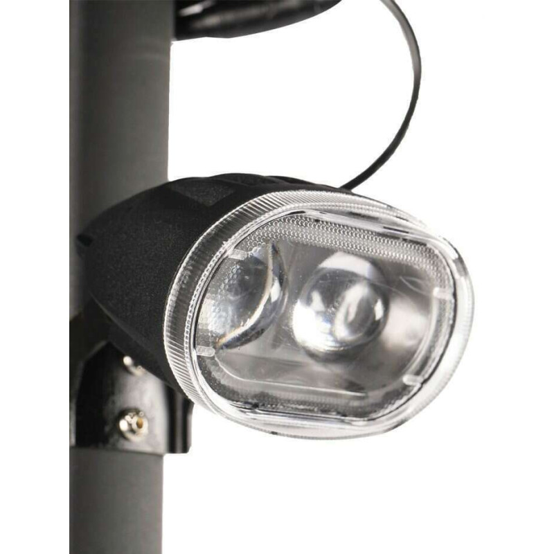 La signalisation lumineuse n’a pas non plus été négligée, à l’avant un éclairage haut équipe le guidon cintrée de cette trottinette, à l’arrière un large feu à LED équipe le repose pied.